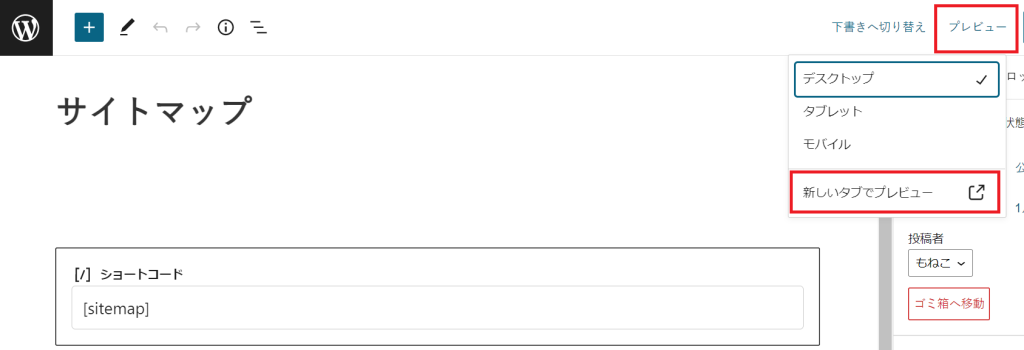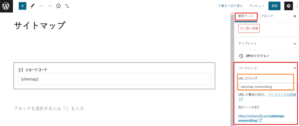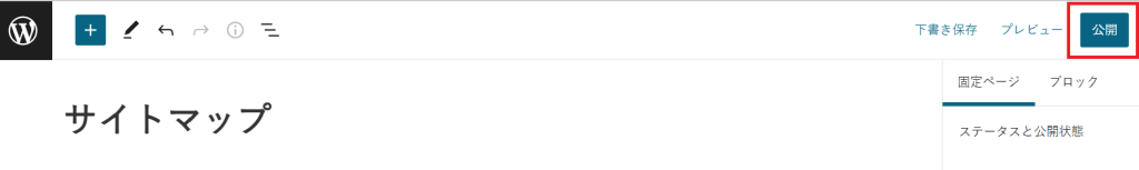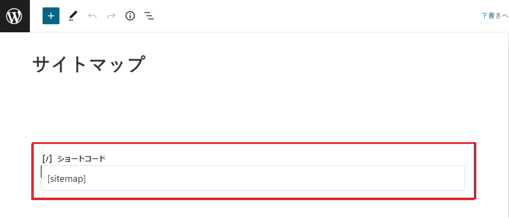 ②タイトルを『サイトマップ』と入力し、本文に『+』→ショートコードで『sitemap』を入力。