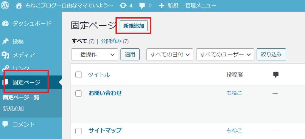 ①Word Pressの『ダッシュボード』にログインし、『固定ページ』→『新規作成』