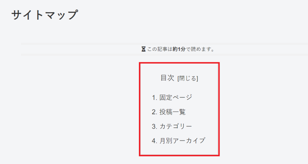 読者向けの【HTMLサイトマップ】は、一覧で表示してあり、「このサイトには、こんな記事が書いてあるのか!」と読者が一目で理解できるようになってます。