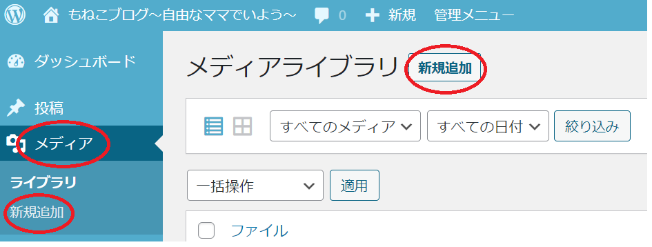 「管理画面」→「メディア」→「新規追加」と進めていきます。